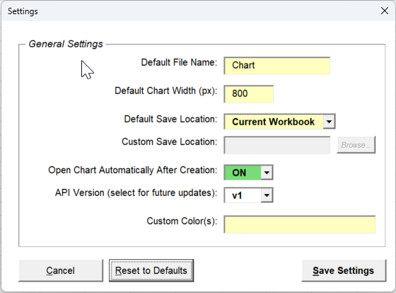 [Save Location]: You can now set a default save location in the settings, choosing between the current workbook (default), Desktop, or a custom file location.